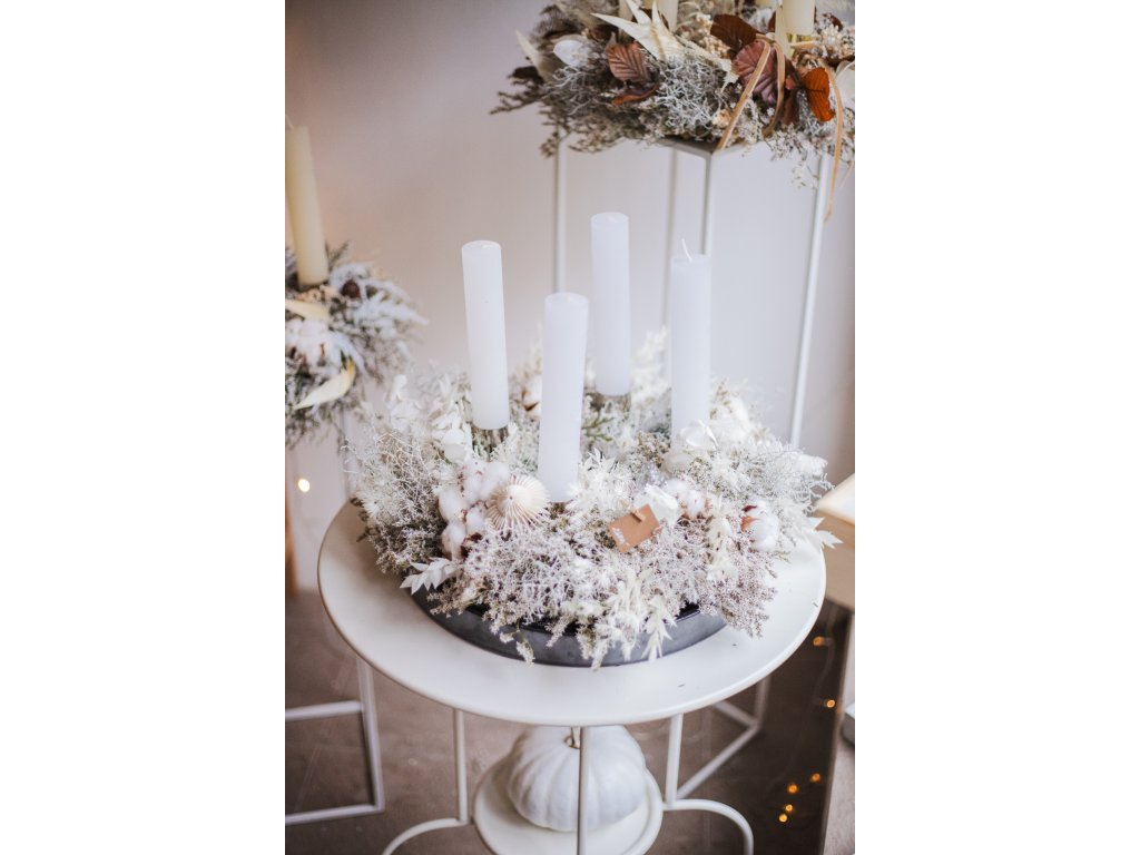 Jemný, čistý, elegantní. Věnec ze sušených a stabilizovaných materiálů - trvalý, vydrží několik let. Průměr cca 40 - 45 cm. Bílé čisté silné a dlouho hořící svíčky.