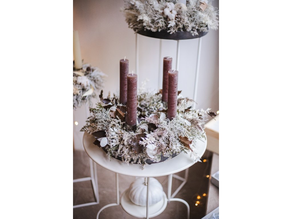 Věnec o průměru cca 45 cm zdoben 4 čokoládově hnědými svíčkami na období adventu. Svíčky jsou kvalitní, nestékají, dlouho hoří. Pod věnec je ideální dát talíř, nebo jinou podložku. Věneček je tvořen z trvalých sušených a stabilizovaných materiálů a doplňků. Po Vánocích lze uchovat na suchém místě v krabici na další rok. Všechny naše věnečky jsou tvořeny celé u nás v ateliéru, motány s láskou a ve vánoční atmosféře. Tu se snažíme předat i k vám domů.