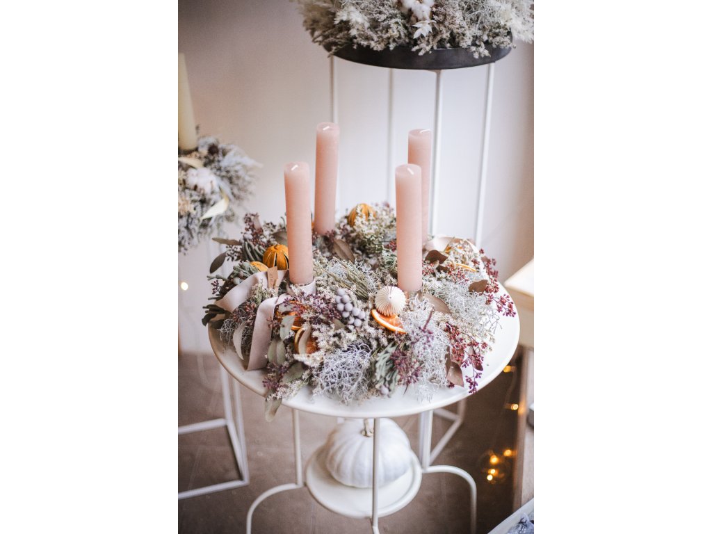 Zajímavě laděný věneček zdobený pudrově růžovými svíčkami. Laděn do šedých odstínů, zdoben pomerančovými plátky a provoněný pomerančovými kulatými ozdobičkami. Trvalý, originální, vázaný s láskou.
