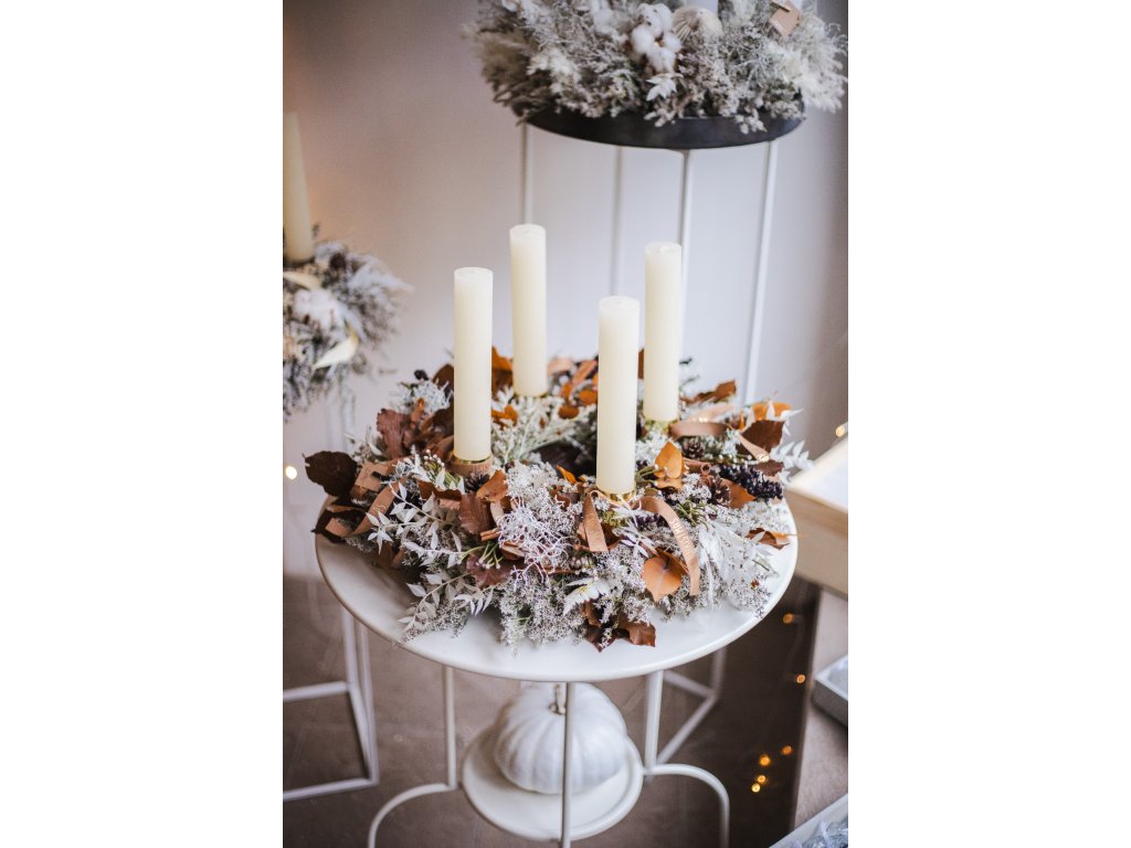 Věnec o průměru cca 45 cm zdoben 4 svíčkami na období adventu. Svíčky jsou kvalitní, nestékají, dlouho hoří. Pod věnec je ideální dát talíř, nebo jinou podložku. Věneček je tvořen z trvalých sušených a stabilizovaných materiálů a doplňků. Po Vánocích lze uchovat na suchém místě v krabici na další rok. Všechny naše věnečky jsou tvořeny celé u nás v ateliéru, motány s láskou a ve vánoční atmosféře. Tu se snažíme předat i k vám domů.