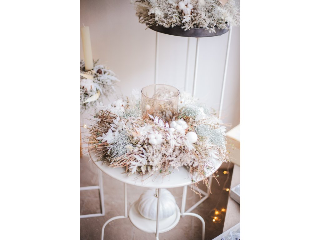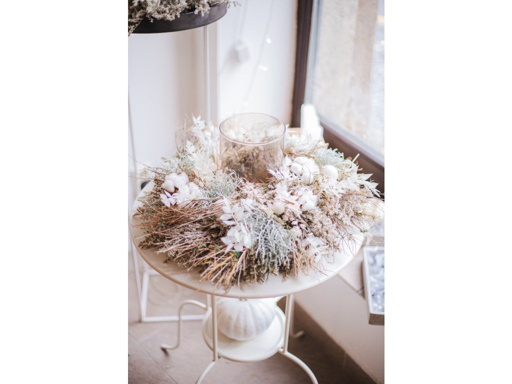 Věnec o průměru cca 45 cm zdoben vázou, která není součástí dekorace. Je možné zakoupit u nás v ateliéru. Není možné poslat poštou. Pod věnec je ideální dát talíř, nebo jinou podložku. Věneček je tvořen z trvalých sušených a stabilizovaných materiálů a doplňků. Po Vánocích lze uchovat na suchém místě v krabici na další rok. Všechny naše věnečky jsou tvořeny celé u nás v ateliéru, motány s láskou a ve vánoční atmosféře. Tu se snažíme předat i k vám domů.
