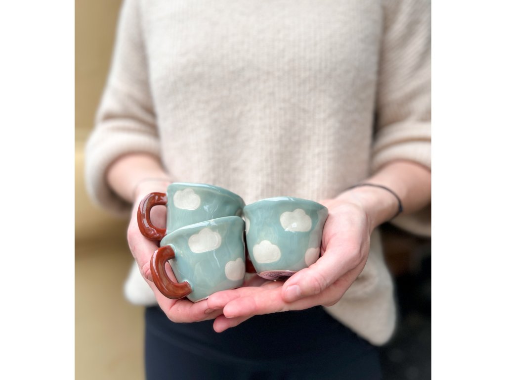 Malý hrneček 9,5 x 5,5 cm v tlumeném modrém odstínu s hnědým ouškem. Malovaný mráčky.