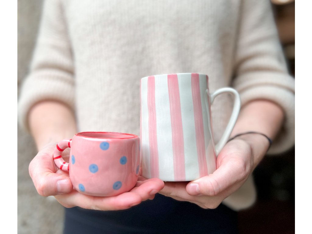 Roztomilý a veselý hrneček v jemném růžovém odstínu pomalovaný modrými puntíky. Červené proužky na oušku. 6,5 x 5 cm.