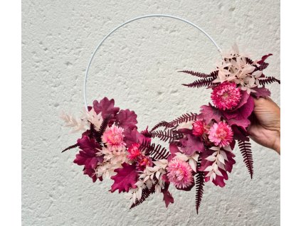 Jemný podzimní věneček na kovové bílé konstrukci vhodný do interiéru na teď nebo do prostoru. Věneček vydrží několik let krásný a neměnný. Tvořen v sytých růžových a...