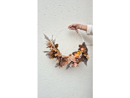 Věneček na konstrukci v odstínech podzimního spadaného listí. Použily jsme sušené a stabilizované kvítky a doplňky spolu s pampasovou trávou. Věneček v interiéru vydrží několik...