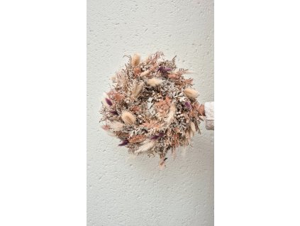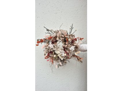 Věneček na konstrukci v jemných a tlumených odstínech hnědé, pudrově růžové a červené. Použily jsme stabilizované a sušené materiály, které vydrží v interiéru neměnné několik...