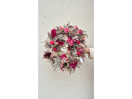 Květinový věnec ze základu sušené statice o průměru cca 40 cm. Věnec je ze sušených a stabilizovaných materiálů, svým složením vhodný do interiéru, nebo na zastřešené dveře....