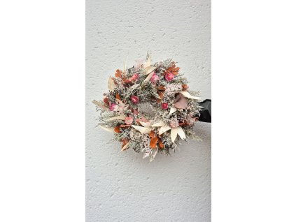 Květinový věnec v podzimních odstínech sladěný do oranžových odstínů. Tvořen ze základu statice, doplněn sušenými a stabilizovanými materiály a vřesem. Průměr cca 45 - 50 cm.