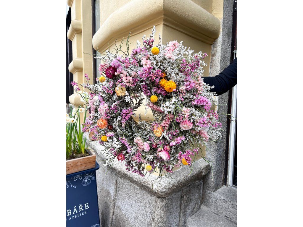 Růžovo žlutý věneček ze základu sušené statice doplněný slaměnkami a craspedií.  Celoroční, vhodný ven i do interiéru.