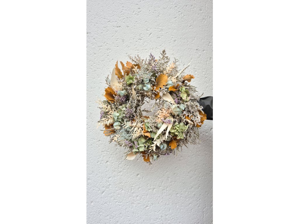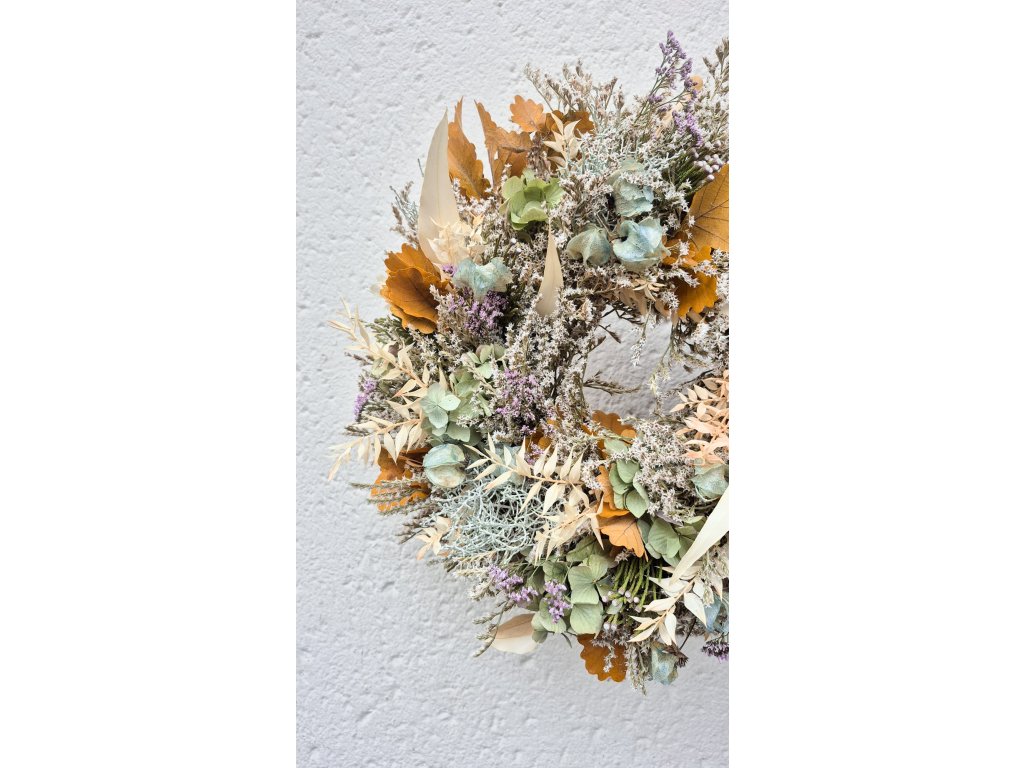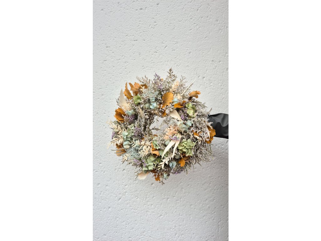 Věneček je zdoben pastelovými tlumenými odstíny sušených a stabilizovaných materiálů eukalyptu, drátovce, brunie, hortenzie, bouganvillei, a bukových listů. Jemnost dodává meruňkový ruskus a lila limonium.