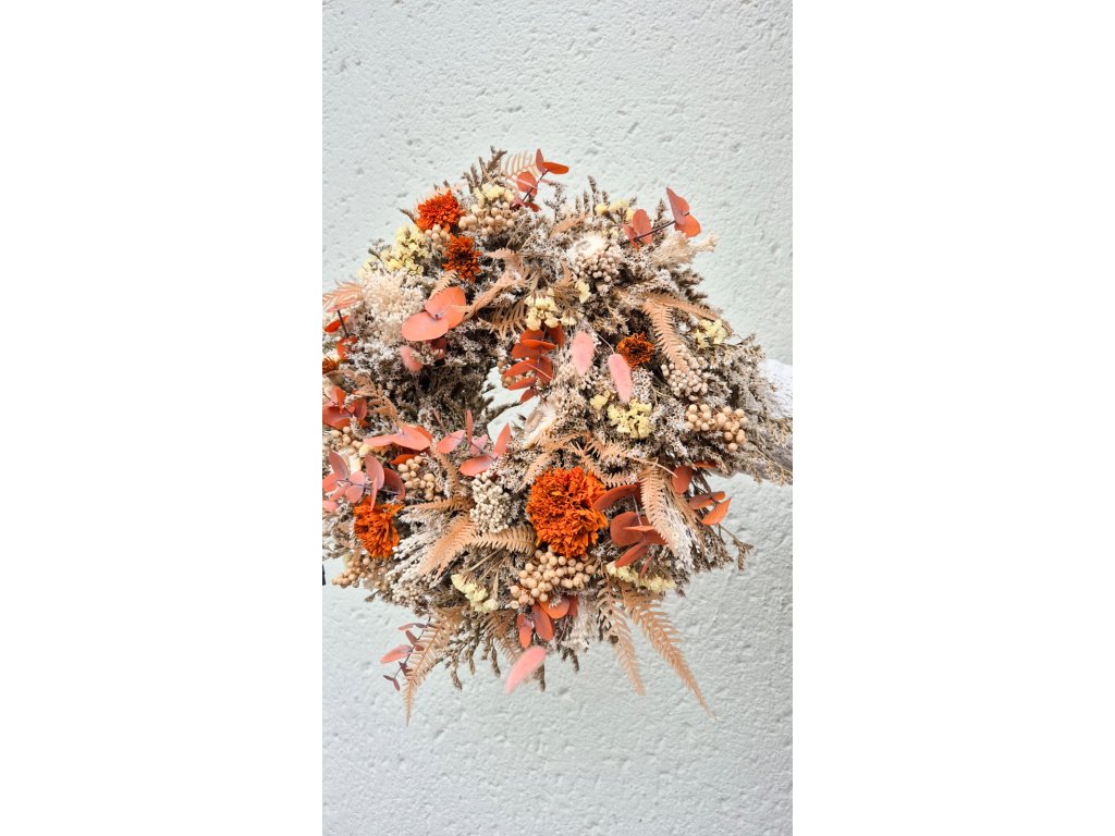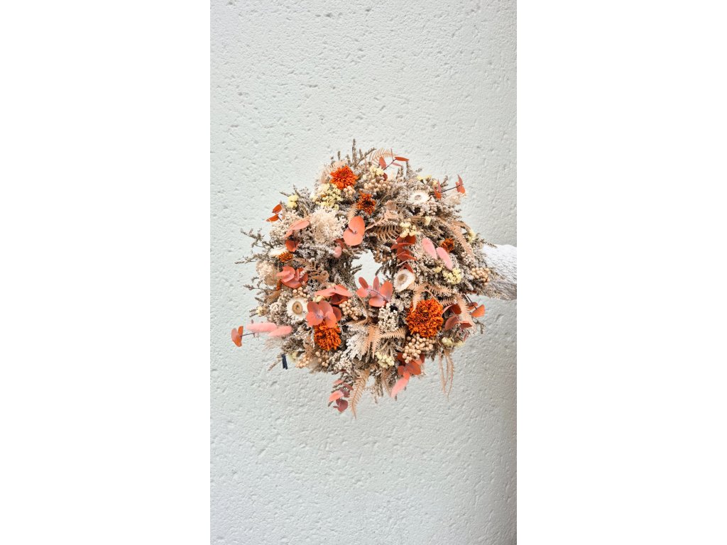 Výrazně laděný věnec ze základu sušené statice zdobený oranžovými, béžovými a pudrovými doplňky. Věneček díky své barevnosti ladí s podzimním počasím, bude ale dělat radost dlouhé roky a je vhodný spíše do interiéru. Sloužit bude i jako výrazný svícen, který vyladí místnost a zútulní každý prostor.