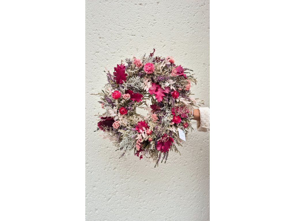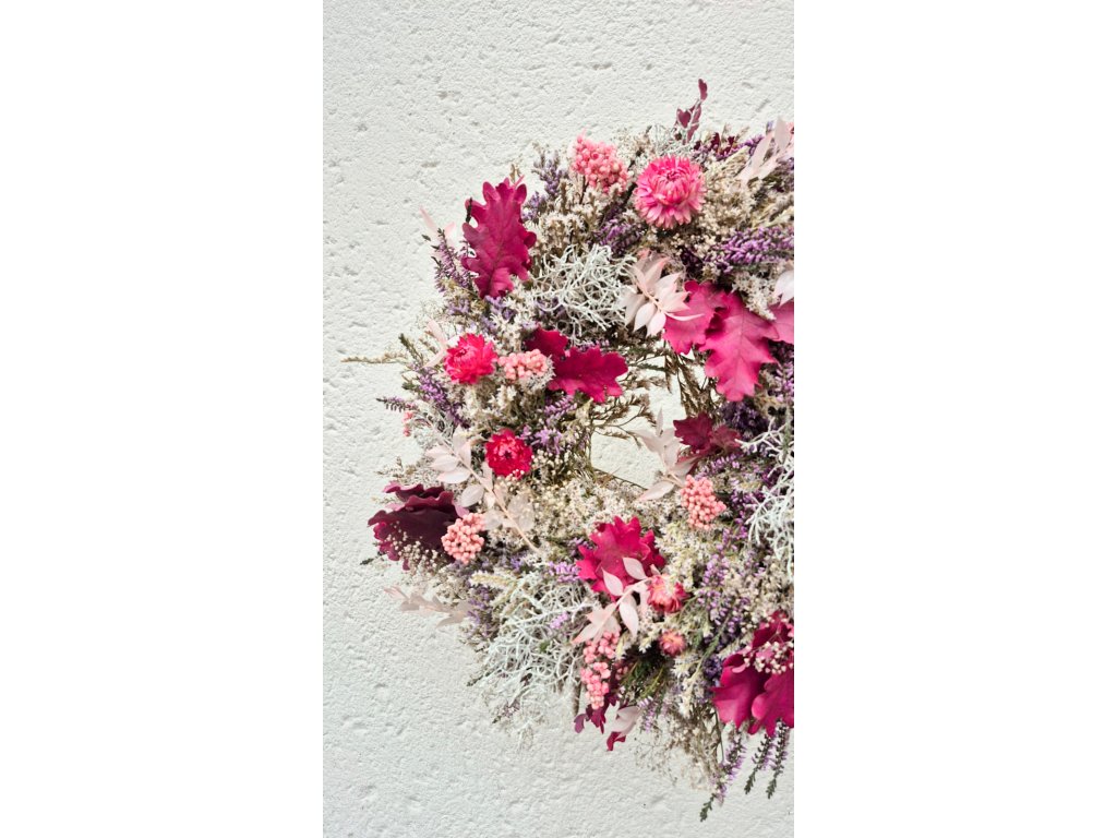 Sytě zbarvený podzimní věnec ze sušených a stabilizovaných materiálů vhodný svým složením spíše do interiéru, kde bude dělat radost několik let. Věneček je o průměru cca 45 cm. Tvořen ze sušené statice, doplněn různými materiály v sytých odstínech růžové, šedé a fialkové. Doplněn například drátovcem, slaměnkami, dubovými listy, ruscusem a dalšími stabilizovanými listy.