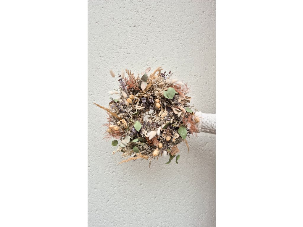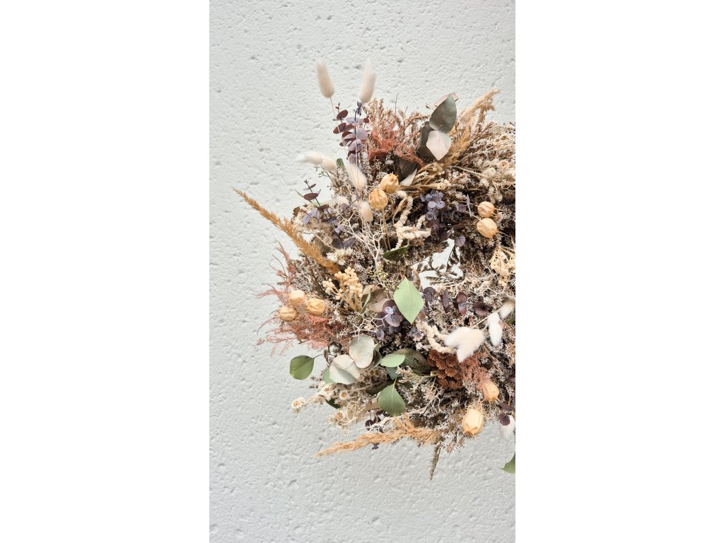 Věnec v neutrálních odstínech bílé, krémové, zelené a hnědé doplněn stabilizovanými a sušenými materiály. Základ tvořen ze sušené statice o průměru cca 45 cm. Věneček vám bude dělat radost roky neměnný.