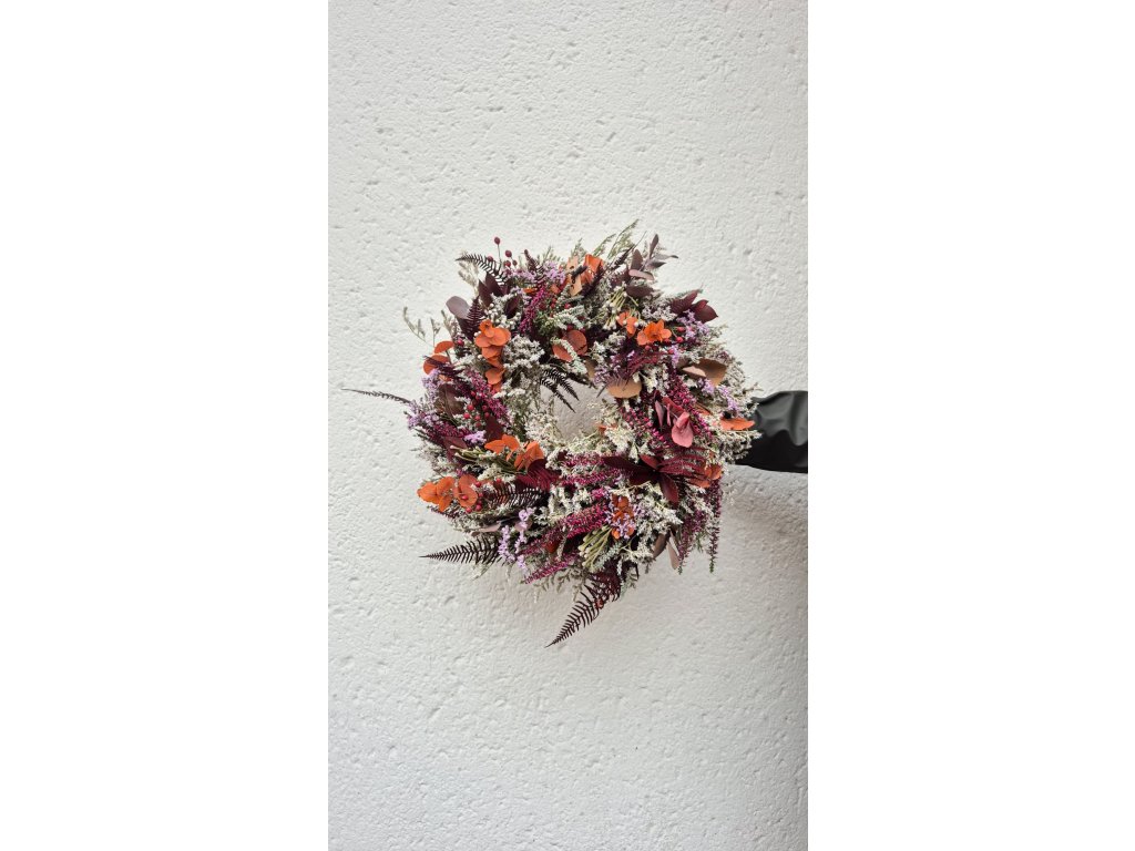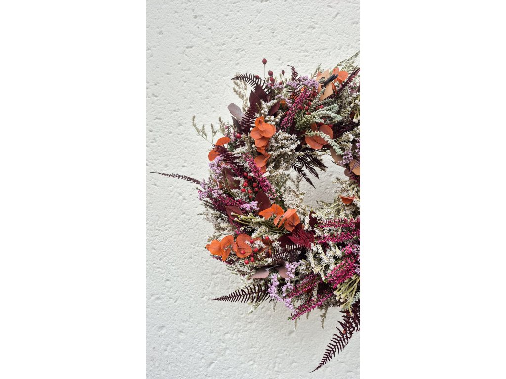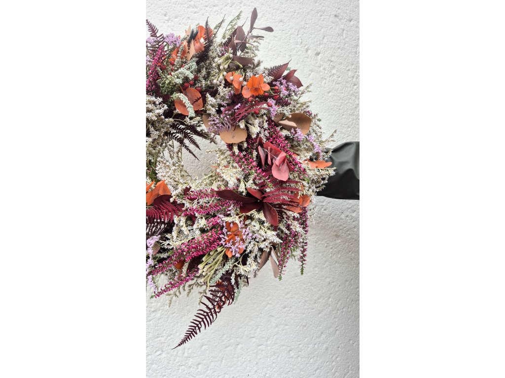 Výrazně zdoben vřesem, šípky, brunií, limoniem a stabilizovaným eucalyptem, ruskusem, kapradím a dalšími listy. Barevně v odstínech vínové, tlumené oranžové, tlumené hnědé, šedé. Výrazný, ale přesto decentní dekorace na dveře, nebo na stůl.