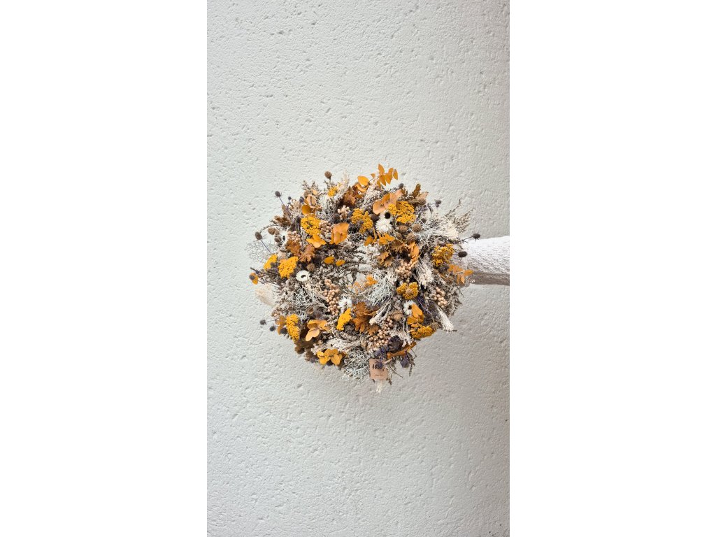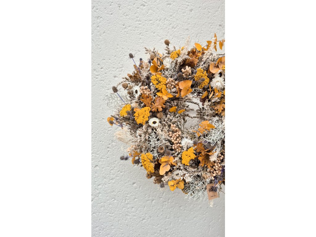 Květinový věnec ze sušených a stabilizovaných doplňků v sytě žlutém odstínu. Babí léto na dveře, nebo na stůl.  Věneček jsme ozdobily drátovcem, kapradinami, stabilizovaným eucalyptem a dubovým listem. Přidaly jsme další sušené žluté doplňky a věneček ladící se západem slunce je na světě.  Přijďte si k nám rozsvítit domov.