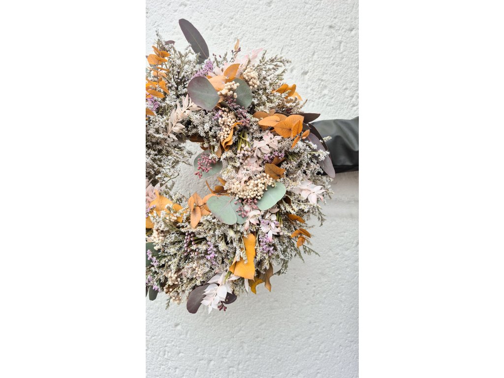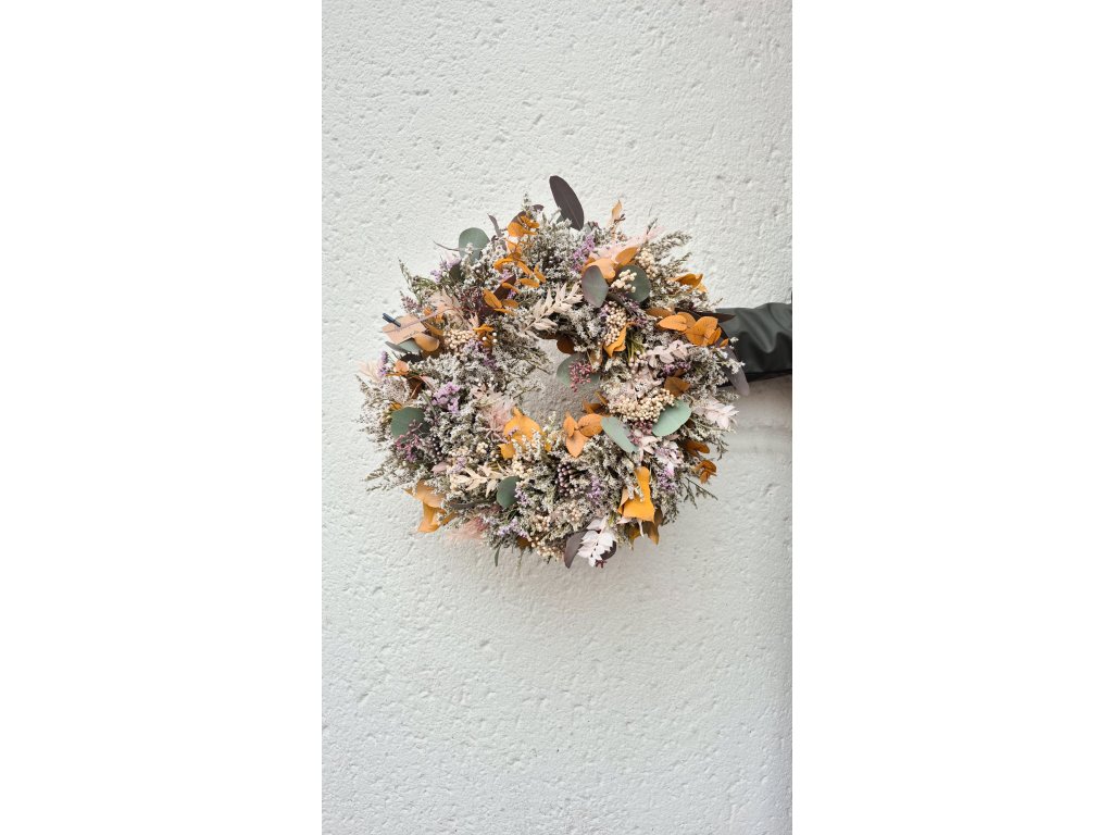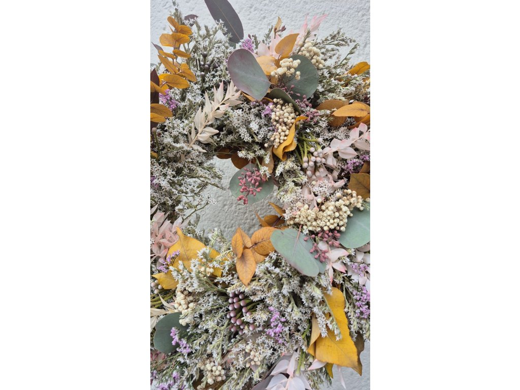 Věneček je zdoben odstíny pudrové, meruňkové, tlumené hořčicově žluté a lila. Doplněn šedou brunií, drátovcem a béžovými stabilizovanými bobulkami. Jemný, decentní, pastelový. Zdoben například stabilizovaným ruskusem, eucalyptem, dubovým a bukovým listem.