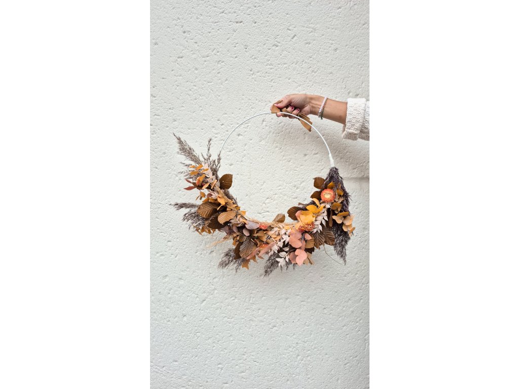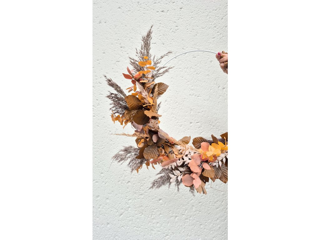 Věneček na bílé kovové konstrukci je krásnou dekorací na dveře i na zeď. Podzimní, ale i celoroční výzdoba, která zútulní váš domov.