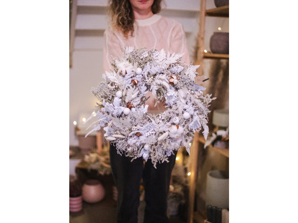 Průměr věnečků je cca 45 cm. Používáme trvalé sušené a stabilizované materiály, při správné péči tedy věnec vydrží více sezón.