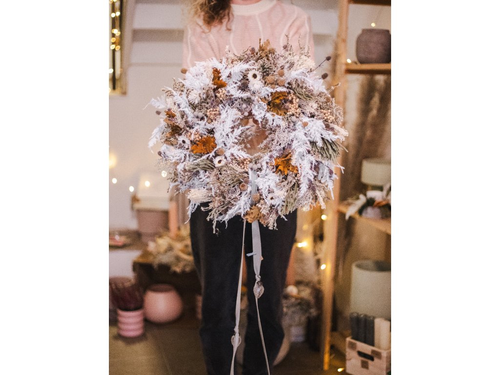 Zimní věneček, který je svým přirozeným laděním vhodný na delší trvání, nejen na období adventu. Věnec je tvořen ze statice, euphorbie, doplněn hnědými stabilizovanými doplňky a bílým kapradím. Věneček zdobí čiré skleněné ozdobičky.